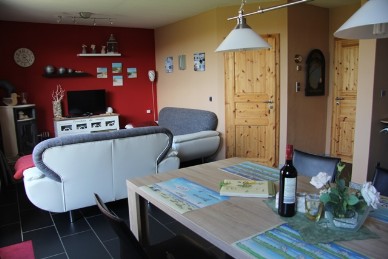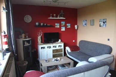 Der Wohnbereich ist mit modernen Fliesenund einer bequemen Sitzgarnitur ausgestattet.Im Bungalow verfügbar sind Kaminofen Sat- TV Stereoanlage W - Lan